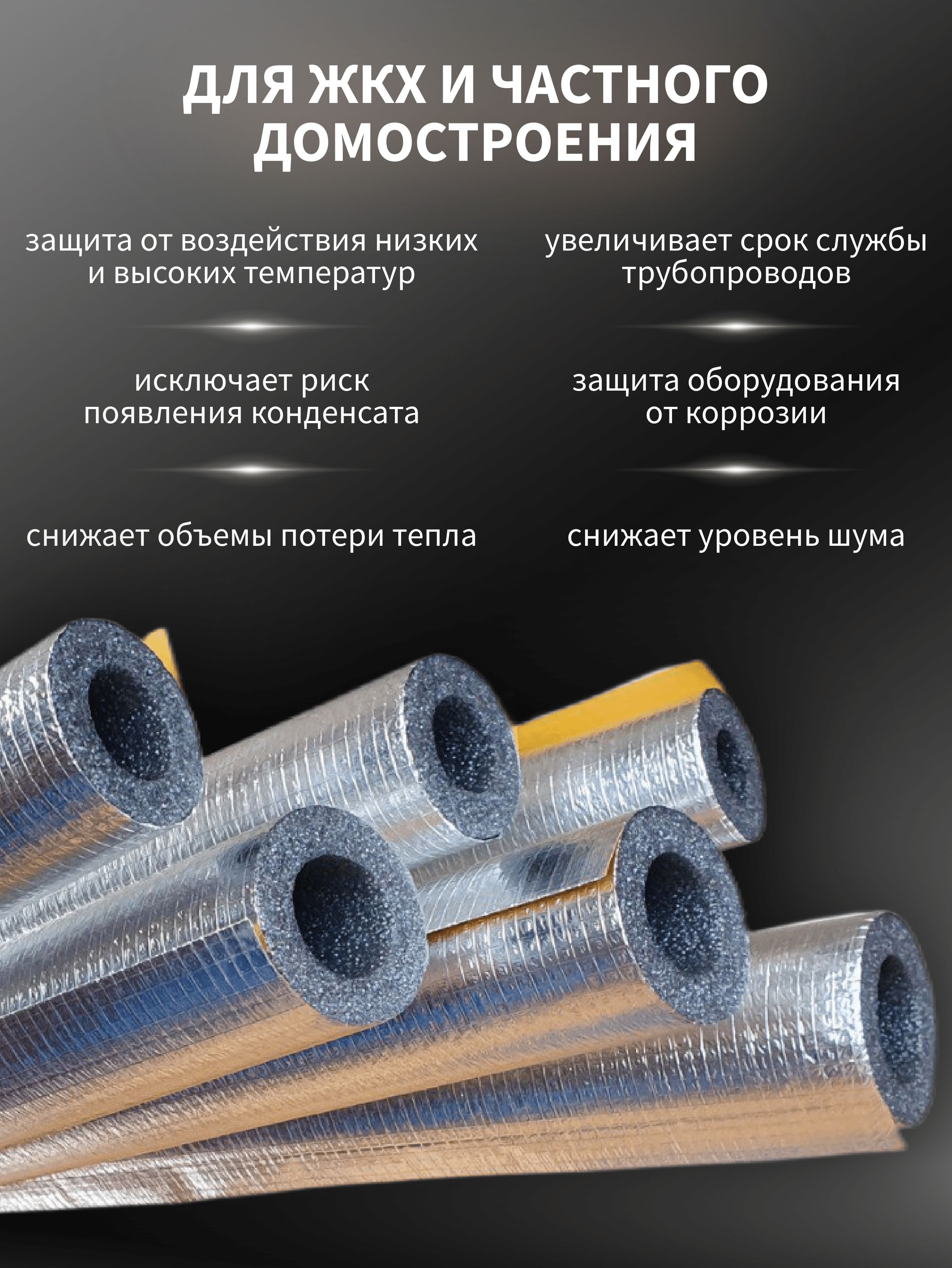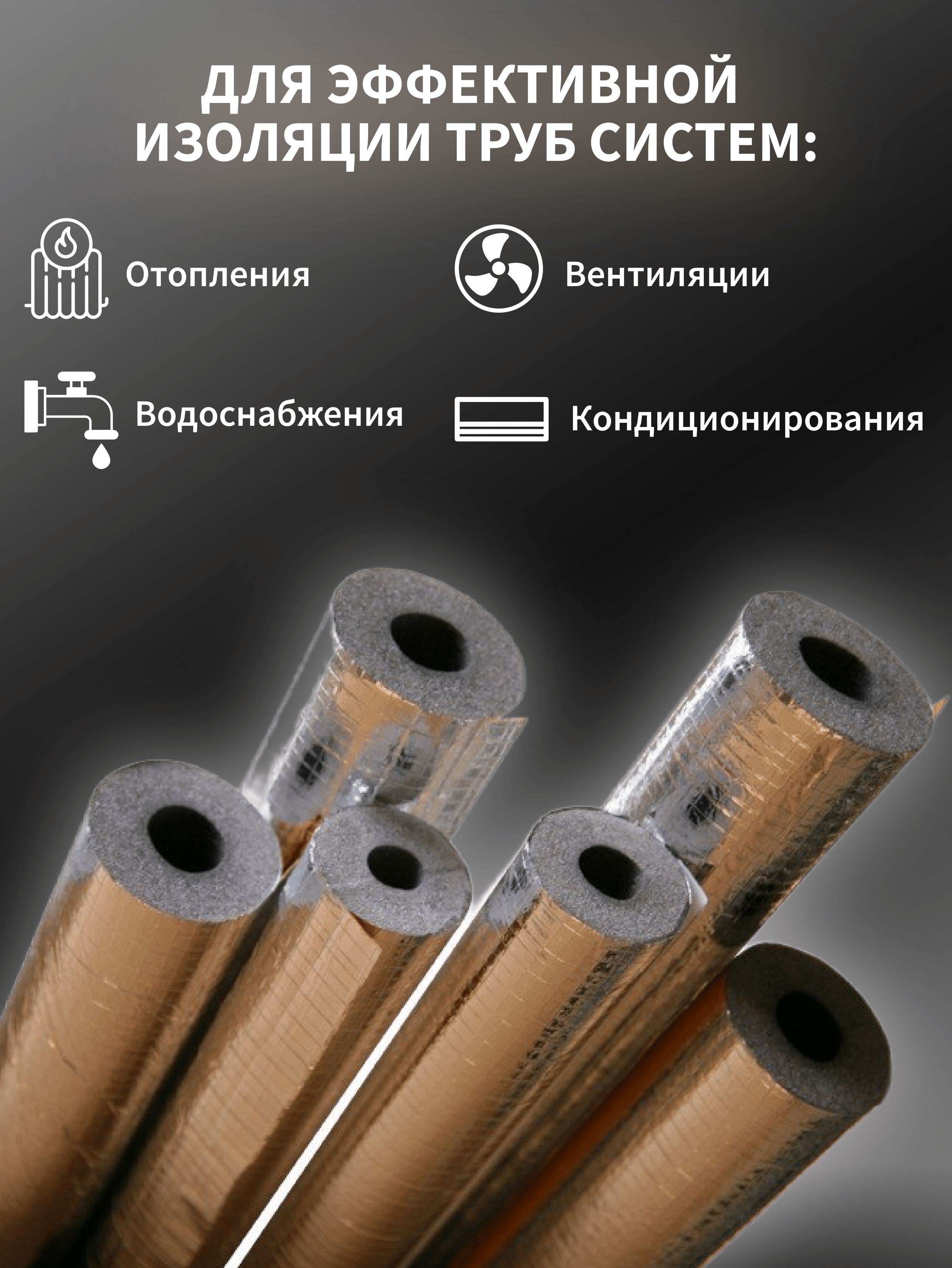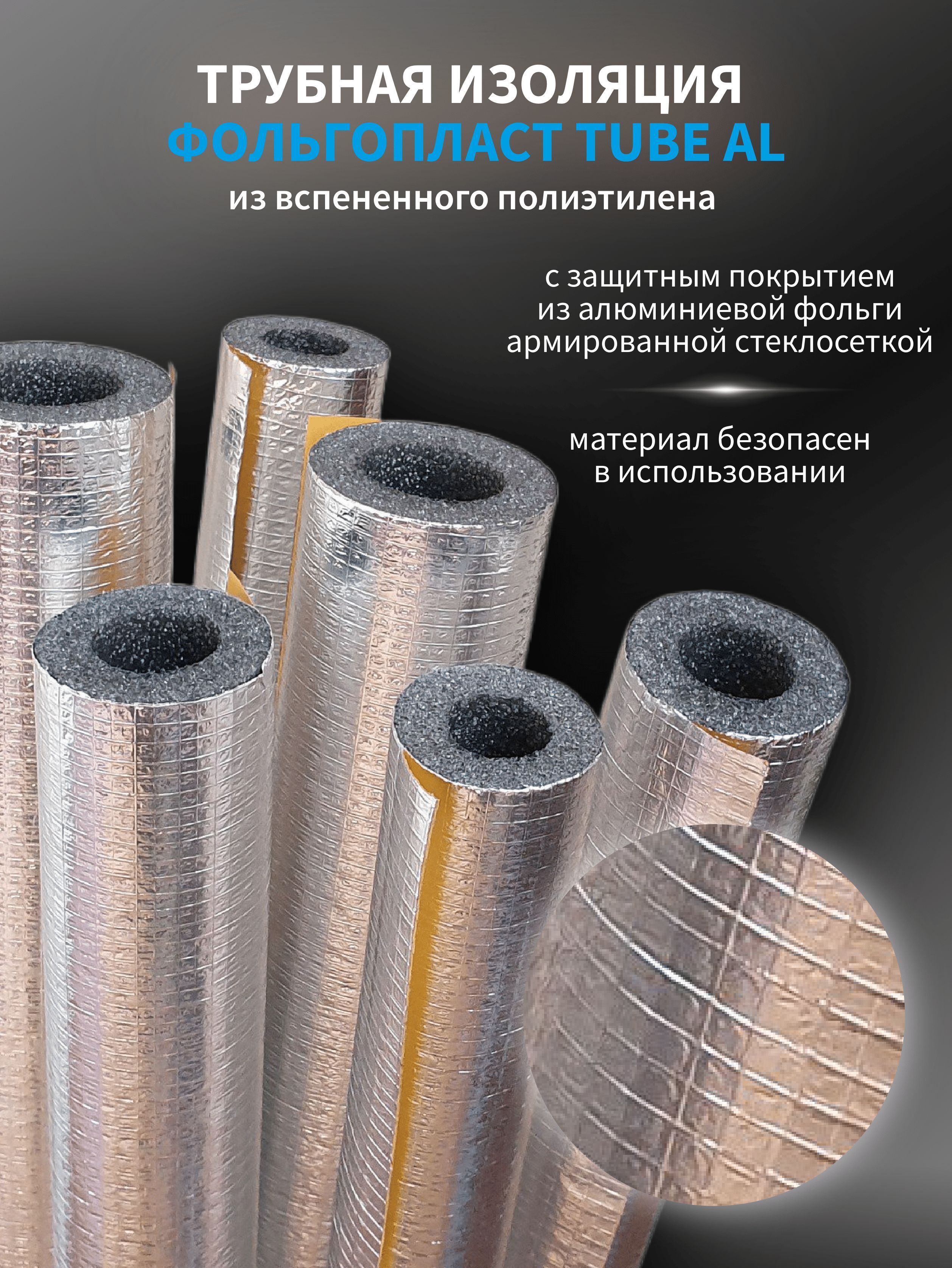 Теплоизоляция для труб - трубки из вспененного полиэтилена с защитным покрытием из алюминиевой фольги армированной стеклосеткой. Технические характеристики материала обеспечивают отличную теплоизоляцию конструкции и контроль над образованием конденсата. Закрытая ячеистая структура гарантирует высокое сопротивление паропроницанию.